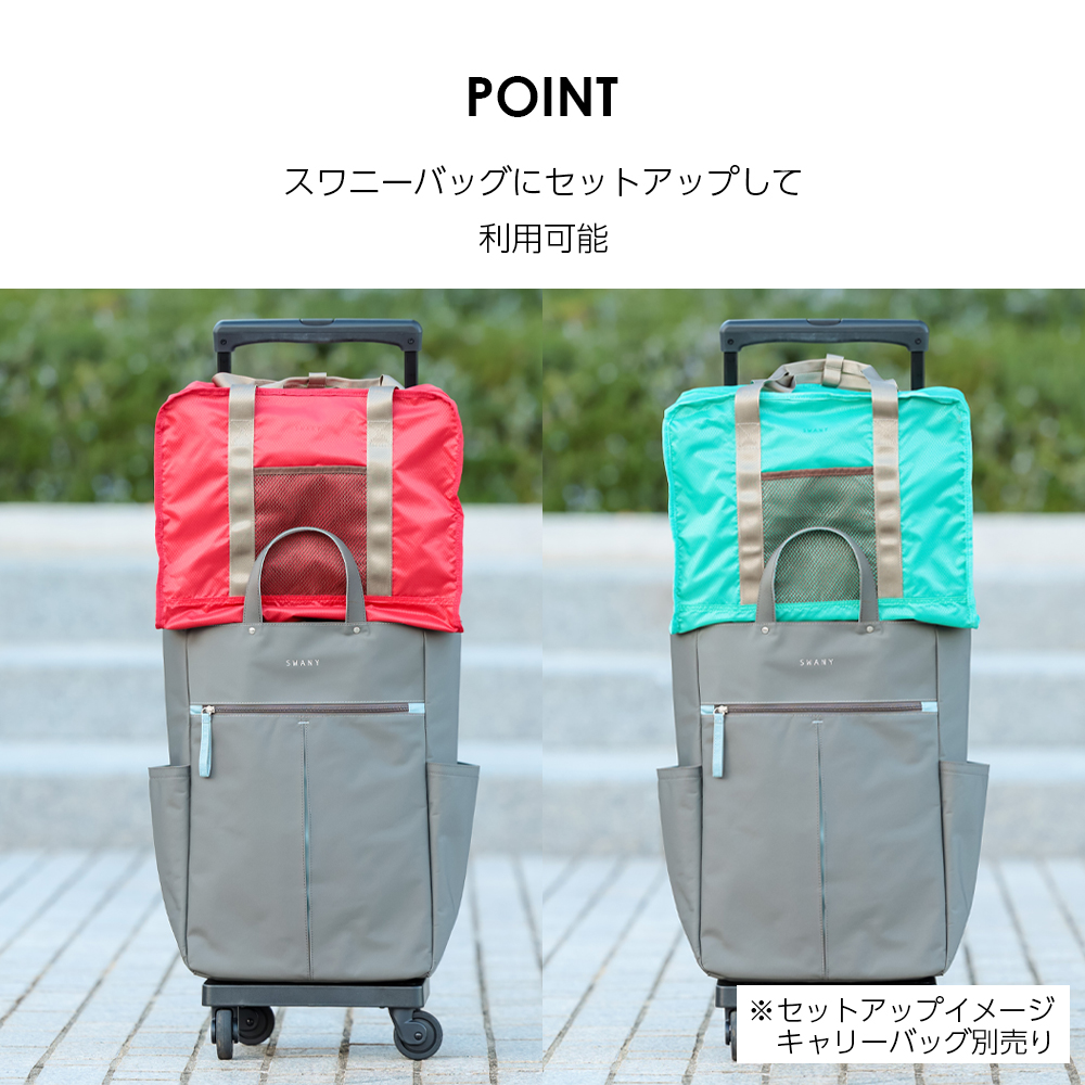 背面にはハンドル通し付きで、スワニーバッグの上にセットでき、移動中もスマートに持ち運びが可能です。